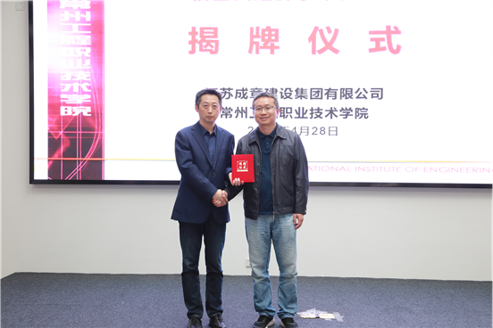 在热烈的掌声中,李雄威院长和张文东先生共同为脚手架实训室揭牌,然后李雄威给张文东颁发了捐赠证书。