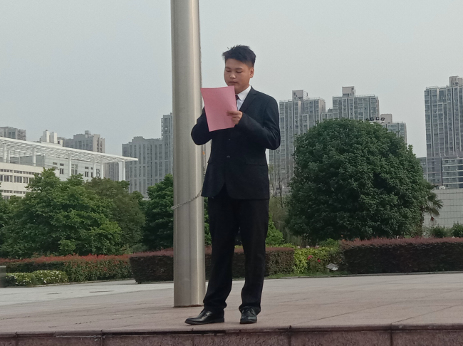 仪式开始,英姿飒爽的国旗护卫队队员们迈着整齐划一的步伐,护送鲜艳的五星红旗进场。国旗伴随着庄严的国歌在微风中冉冉升起,迎风飘扬。在场的每一个人向着五星红旗行注目礼,深怀对祖国无限的热爱和崇高的敬意。升旗礼毕,地遂2021班夏建军同学向同学们发出创建“无烟校园”的倡议:从自我做起,自觉拒绝烟草,树立吸烟危害自己及他人健康的理念,养成良好的健康生活卫生习惯和文明生活方式。