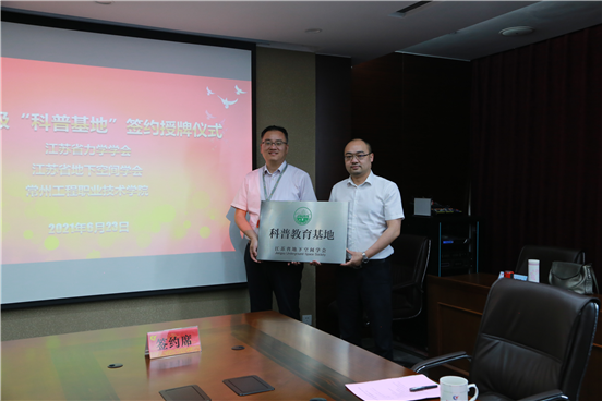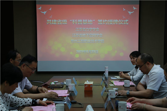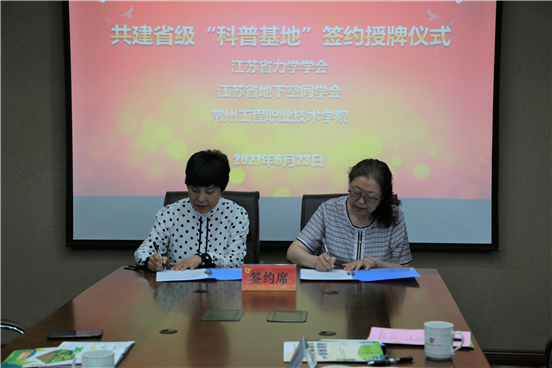 潘玉琴代表学校分别与江苏省力学学会、江苏省地下空间学会签订共建“科普教育基地”协议,并接授两个学会的授牌。