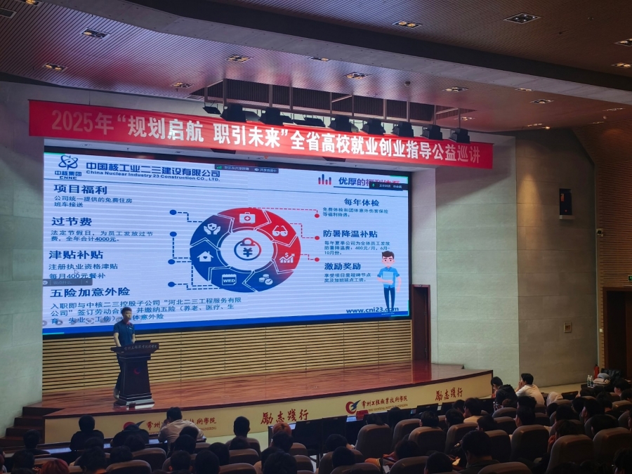 在岗位实习动员大会后,进行了中国核工业二三建设有限公司专场宣讲会,公司人力资源部招聘主管徐英杰详细介绍了公司的发展历程、组织架构和行业地位,重点展示了公司在核电建设领域的代表工程、技术创新成果和所获得荣誉。在招聘政策方面,徐英杰解读了实习岗位需求、薪资待遇、职业发展通道等学生关注的内容,并欢迎建工学子加入企业实习就业。宣讲结束后,企业代表与学生们进行了面对面交流,现场气氛热烈。