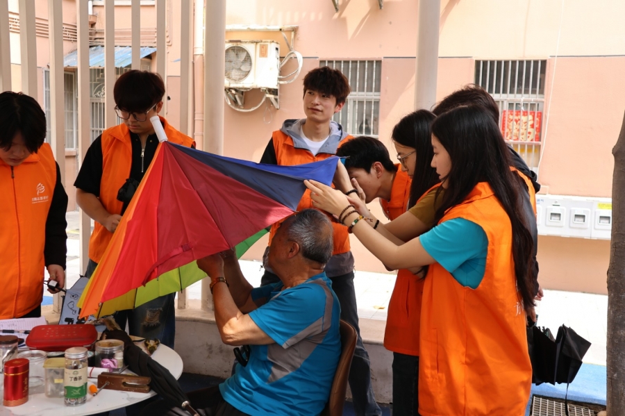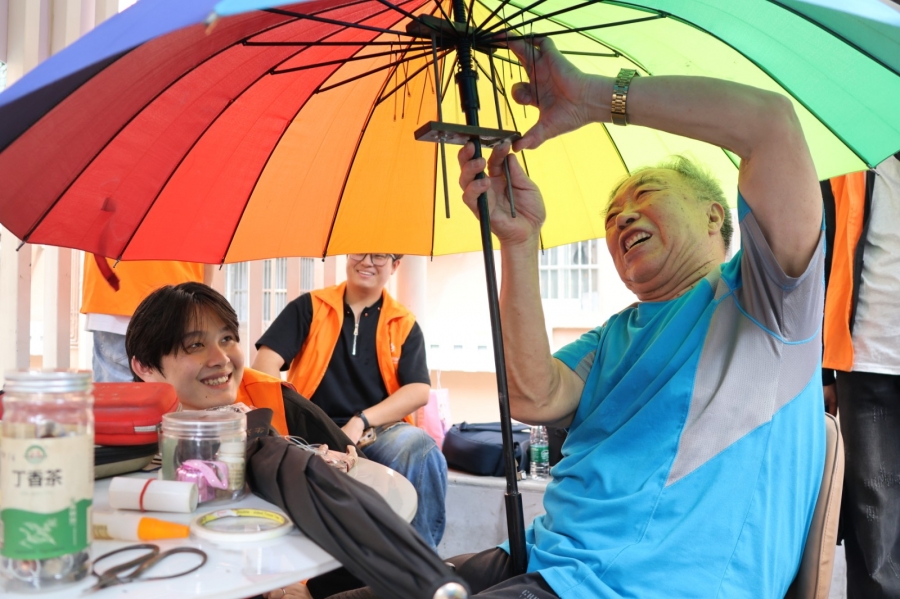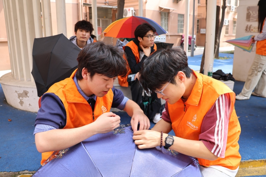 活动伊始,86岁的吴志佳在社区老槐树下的修伞摊前,向学生们展示了一本特殊的 “时光账本”。自 2006 年起,他已义务修伞超七千把,磨损的修伞钳更换3次,积累的伞骨废料装满 1 间仓库。吴志佳手持修伞钳,向围坐的学生们分享道:“起初修伞只是想帮邻里一把,后来发现修好的不仅是伞,更是人与人之间的信任与温暖。” 现场,学生们仔细观察着褪色的工具箱、排列整齐的螺丝盒,深刻体会到平凡坚守背后的伟大力量。