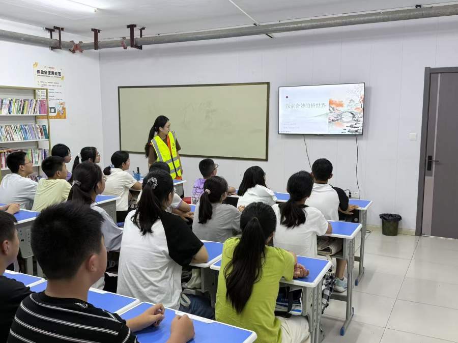 “大家看,不用一根钉子,这些木块就能牢牢拼在一起,这就是咱们中国古代建筑的智慧——榫卯结构!”志愿者手持简易榫卯组件,生动地讲解着其中蕴含的力学原理和工匠精神。孩子们瞪大了眼睛,对这种神奇的结构充满好奇。课堂内容丰富多彩,不仅有榫卯结构的原理展示与动手拼装体验,志愿者还精心准备了“桥梁之美”、“东台特色建筑”等专题分享。通过精美的图片和通俗易懂的讲解,孩子们领略了不同桥梁的形态与力量之美,也认识了家乡建筑的独特风貌,对“建筑”有了更直观和亲切的理解。