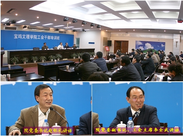 3月22日,院工会在宝鸡市宝成宾馆举办了以学习贯彻党的十七大精神为主题的工会干部培训班。院工会委员、各分会主席、分会工会委员及有关部门负责人共90余人参加了培训。院党委书记赵怀礼,院党委副书记、工会主席李全武出席会议并作重要讲话。培训会由院工会副主席刘锡让主持。