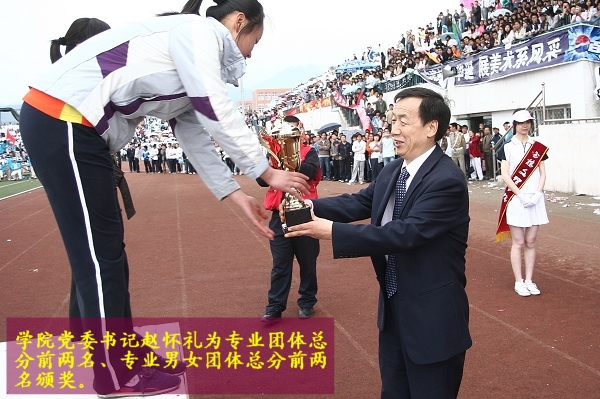 在闭幕式上,副院长赵怀玉代表学院党委及行政向在本次运动会中取得优异成绩的代表队和运动员表示了热烈的祝贺。他讲到,本届运动会是我院顺利通过教育部本科教学水平评估并取得优秀评估结果后举办的一次体育盛会,也是我院全体师生员工支持2008北京奥运的具体行动,更是全体师生员工为喜庆建校50周年华诞的丰厚献礼。运动会上体育健儿表现出的顽强拼搏、勇攀高峰、催人奋进的精神,必将和我院多年来形成的评建精神融为一体,对我院各项事业的改革和发展起到积极的促进作用。我们要在院党委的正确领导下,继续发扬评建精神,强化教学中心地位,注重素质教育,团结一致、同心同德、锐意进取,为构建和谐校园培养高素质的优秀人才而努力奋斗!