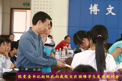赵怀礼在讲话中首先代表学院党政、代表全院师生员工向家庭受灾的学生及其家人表示慰问,向死难者表示哀悼。他说,面临严峻的考验,党中央及时安排部署,发出号令,抗震救灾工作紧张有序的展开。在灾难面前,我院师生表现出了良好的精神风貌,各项抗震防震工作有条不紊的进行,充分体现了“和衷共济,众志成城”的抗震精神。全院师生心系灾区,弘扬无私奉献的精神,在积极开展向灾区献爱心捐款活动的同时,想方设法帮助灾区学生渡过难关。他鼓励同学们要稳定情绪,振奋精神。同时要刻苦努力,发奋学习,努力成为对国家、社会有用之才。