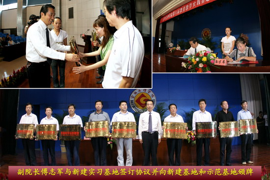 教务处副处长田延峰宣读了我院新增的兼职教授、副教授、副研究员名单,教务处副处长孙新宣读了我院新建的教育教学实践基地名单,教务处实践教学管理科科长刘景世宣读了我院新增的示范实习基地名单。傅志军与新建教育教学实践基地领导签订了协议书,向他们赠送了铜牌,并向新增的示范实习基地领导赠送了奖牌,向新增的兼职教授、副教授、副研究员颁发了聘书。会后,与会代表还参观了我院院史展览馆,代表们为我院在培养高素质人才方面取得的成绩表示赞赏,并对我院的开放式办学和跨越式发展给予了高度评价。