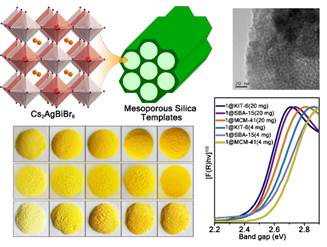 该研究通过极性溶剂诱导的方法将无铅双钙钛矿金属卤化物引入到介孔氧化硅模板中,成功得到了负载高度单分散的双钙钛矿金属卤化物纳米晶体的介孔氧化硅复合材料,并通过调整介孔氧化硅的孔径和孔道形状来调控金属卤化物纳米晶体的尺寸和形貌,提出了利用介孔氧化硅制备金属卤化物纳米晶体的新思路。