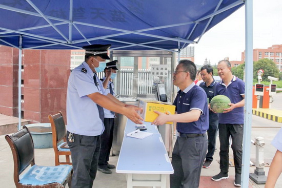 7月10日上午,校党委副书记栾宏、校工会主席郭宏科带领工会及扶贫办工作人员,先后到保卫处、后勤管理处(后勤服务集团)、学生处、招生就业处、团委、教务处等部门,看望和慰问在高温天气下的一线工作人员,为正在高温中坚守岗位的工作人员送去了西瓜、甜瓜、饮料等清凉物品。