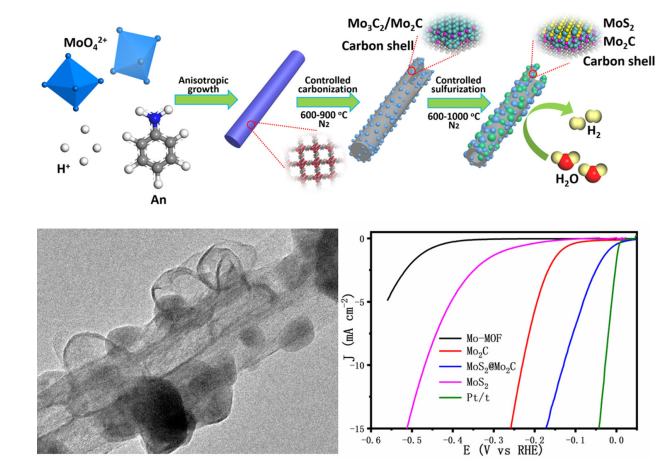 具有高活性、稳定性以及有效进行析氢反应(HER)的非贵金属电催化剂对于低成本和大规模水分解至关重要,单一的MoS2在碱性环境中具有电催化析氢惰性,不利于水的吸/脱附,因此,通过设计和优化MoS2催化剂材料的基本结构,使其在碱性环境下具有更丰富的活性位点以及高的导电性是非常有必要的。该工作通过两步煅烧和硫化工艺,首次从碳化的Mo2C-Mo3C2异质纳米线中构建了氮掺杂碳上的MoS2@Mo2C空心异质结构电催化剂材料。研究结果表明,设计的电催化剂能够有效增强碱性环境中的电催化活性:起始电势为28 mV,在10 mA cm-2电流密度下的过电势为129 mV,Tafel斜率较小,为78 mV dec-1,以及长期的稳定性。这一研究成果对电催化领域中非贵金属催化剂的设计具有指导意义。(学科建设与研究生教育管理处、物理与光电技术学院 文/赵亚儒 图/贾丽娜 审核/赵天绪、钱郁)