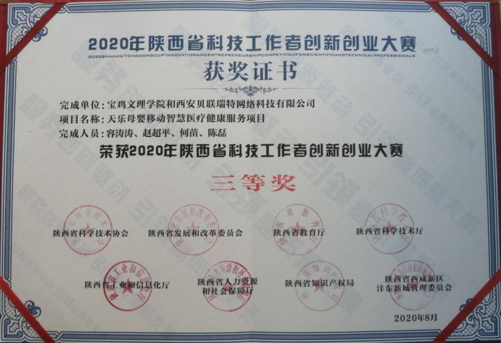 8月25日至27日,2020年“沣东杯”陕西省科技工作者创新创业大赛在西咸新区沣东新城举行,bat365物理与光电技术学院教师容涛涛博士的项目《天乐母婴移动智慧医疗健康服务项目》荣获三等奖。