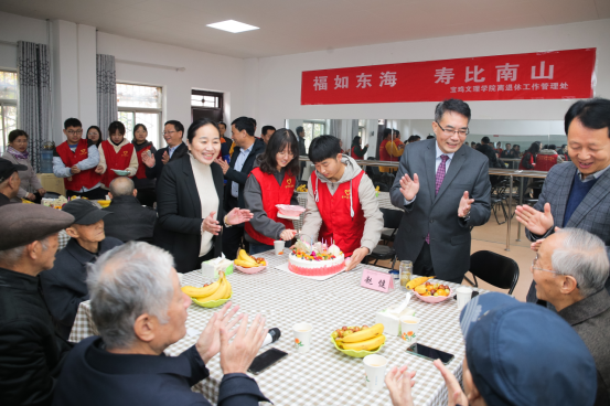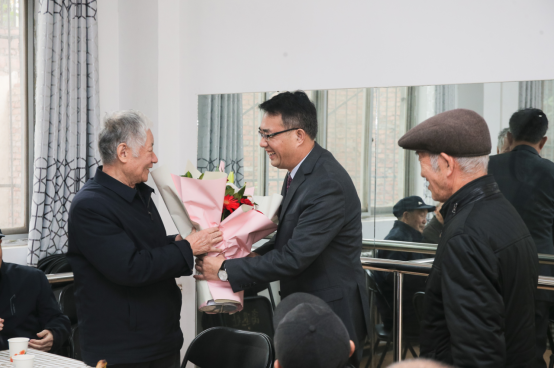 赵健代表学校党委行政和全体教职员工向老寿星们及全校离退休老同志致以诚挚的祝福,对离退休老同志为学校建设发展作出的积极贡献表示崇高的敬意。他强调,尊老敬老是中华民族的传统美德,也是学校历届班子工作的重中之重,学校将会一如既往地对离退休老同志在政治上尊重、思想上关心、生活上照顾、精神上关怀,为老同志安享晚年创造有利条件。他向各位老同志通报了今年学校党政主要工作,他指出,2020年是学校加快追赶超越、实现创大更名目标的攻坚之年,在包括离退休老同志在内的各个方面的共同努力下,学校各项工作有了新的进步。目前,全校上下人心思进、百业欲新,希望老同志继续关心和支持学校建设发展,为创建高水平大学和美丽家园贡献余热、再立新功。最后,赵健为老寿星们赠送了生日贺礼和鲜花,全体人员为老同志共唱生日祝福歌。