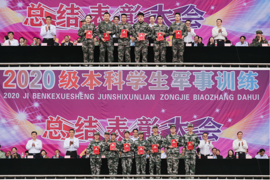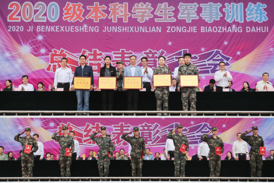 副校长王富平宣读了《关于表彰2020级学生军训工作先进单位和先进个人的决定》。学校领导及部队首长为先进单位及先进个人代表颁发奖牌和证书。