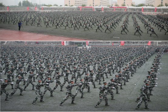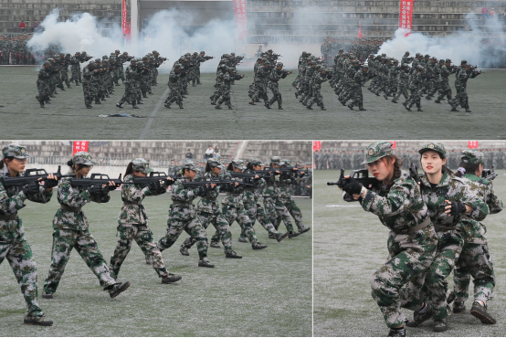 伴随着铿锵有力的口令,各连队在教官的指挥下进行了队列、军体拳、战术动作、花样方针等军训汇报表演,全面展示了11天来的训练成果。同学们步调一致、精神饱满、动作准确,展示出了军人的风范、军人的坚定与气魄。军训汇报亮点纷呈,赢得了在场师生的阵阵掌声。