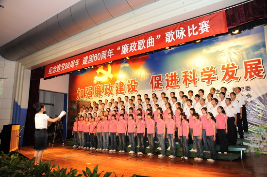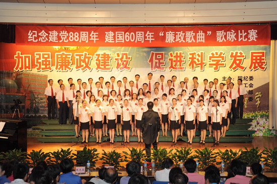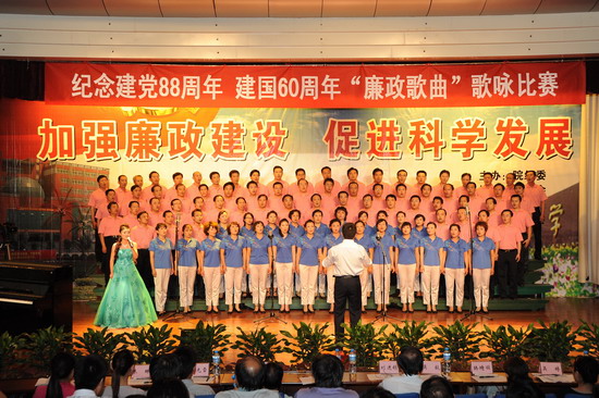 在庆祝中国共产党建党88周年、喜迎建国60周年到来之际,由院纪委、院工会、党委宣传部、院团委举办的以“加强廉政建设,促进科学发展”为主题的 “廉政歌曲”演唱比赛于6月19日下午和晚上在新校区音乐厅举行。有20个党总支代表队参加了比赛。