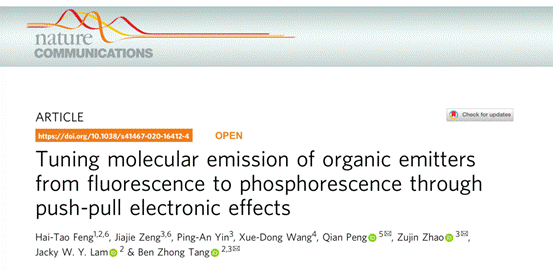 其中,研究论文“Tuning molecular emission of organic emitters from fluorescence to phosphorescence through push-pull electronic effects”发表在Nature子刊Nature Communications(SCI一区Top期刊,影响因子12.18)上,论文第一作者为冯海涛博士,bat365是第一通讯单位,bat365AIE中心名誉主任、香港科技大学唐本忠院士为论文通讯作者,这也是bat365第一次以第一单位在高水平Nature子刊上发表学术论文。