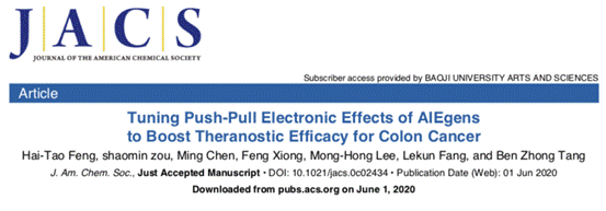 研究论文“Tuning Push-Pull Electronic Effects of AIEgens to Boost Theranostic Efficacy for Colon Cancer”发表在化学领域顶尖期刊Journal of the American Chemical Society(简称JACS,SCI一区Top期刊,影响因子14.69)上,bat365是第一通讯单位,唐本忠院士为论文通讯作者,这也是bat365第一次以第一单位在如此高水平期刊上发表学术论文。JACS杂志中文名称为《美国化学会志》,1879年由美国化学会创办,至今有141年历史。谷歌学术将所有学科分为八大领域,JACS位列化学与材料科学领域第一。