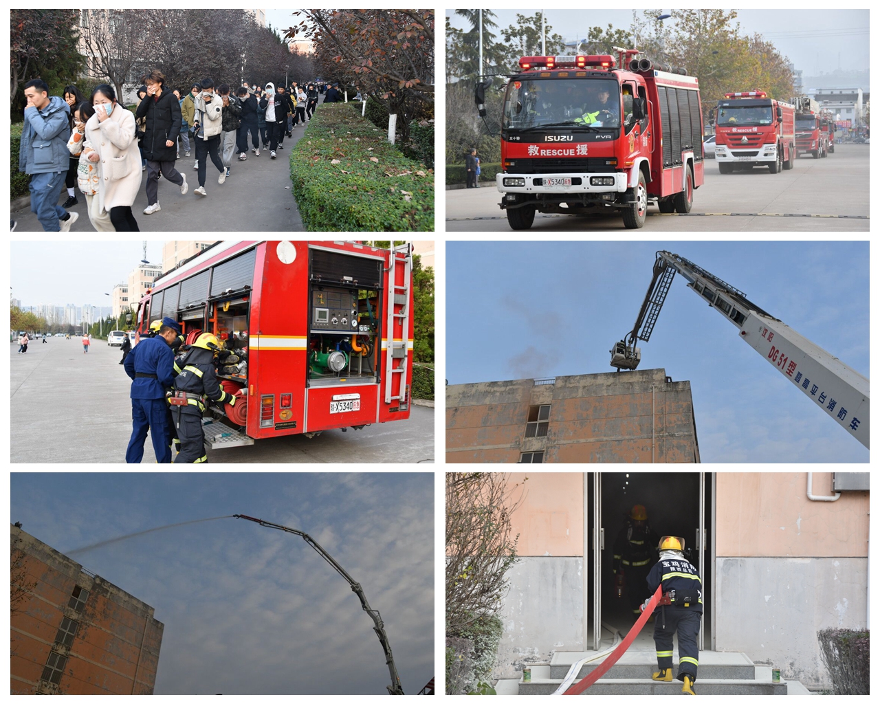 16时30分,消防灭火及应急疏散演练正式开始。2号学生公寓多处“燃起浓烟”,有被困学生在楼内向外呼救。接到火情报告后,学校迅速启动应急预案,学校义务消防员第一时间赶赴现场开展初起扑救,并有序组织楼内学生向楼下空旷区域紧急撤离。消防救援力量闻警而动,火速调遣消防灭火车和登高救援车开展应急救援。高喷消防车迅速向2号学生公寓着火点实施高压喷水灭火,消防官兵搜救组和登高平台消防车立即展开搜救。经过半小时奋战,楼内学生安全有序撤离,三楼和楼顶被困人员被成功解救。最终,模拟的一场“大火”被顺利扑灭。