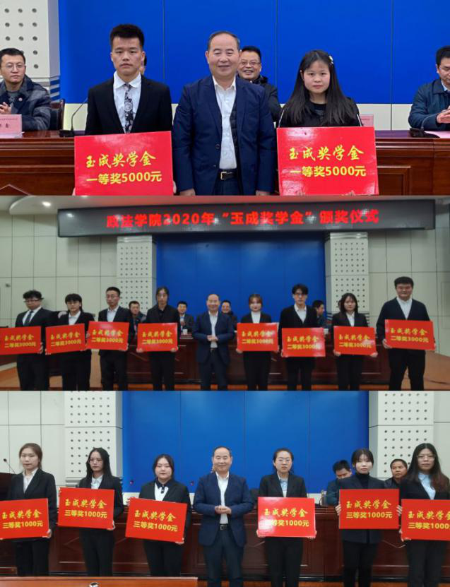 11月25日下午,政法学院在高新校区木铎厅举行“玉成奖学金”颁奖仪式。校党委副书记栾宏、“玉成奖学金”捐助人王政军出席颁奖仪式并讲话,学院党委书记白志勇主持颁奖仪式。