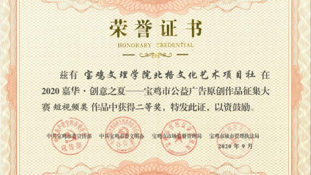 近日,“2020嘉华.创意之夏--宝鸡市公益广告原创作品征集大赛”落下帷幕,bat365选送的公益广告作品《归来》获得短视频类二等奖。
