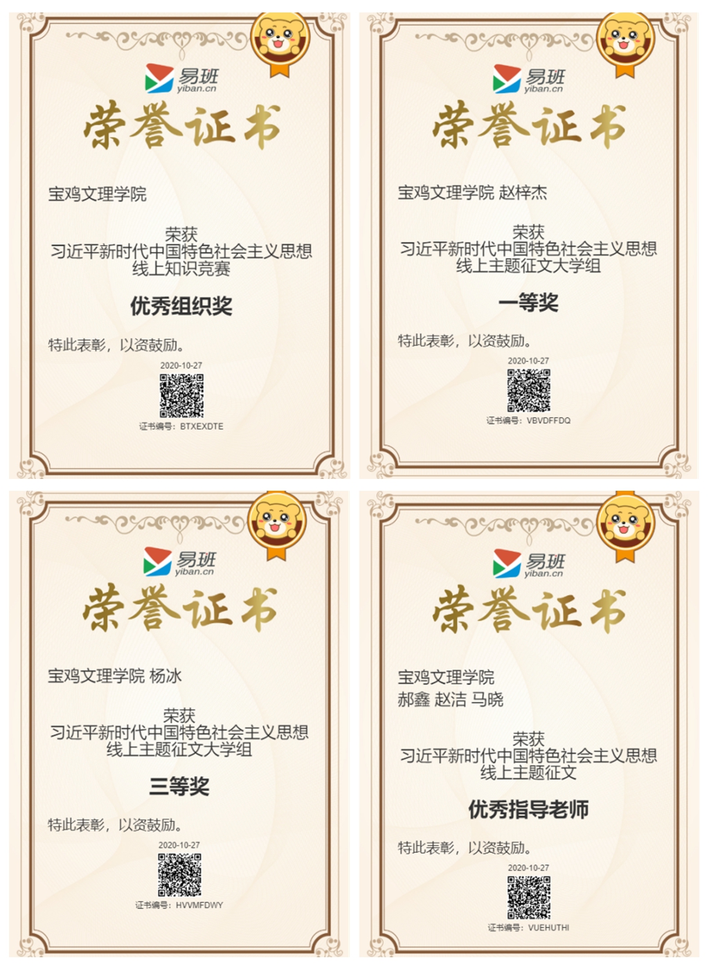 在“习近平新时代中国特色社会主义思想线上主题征文和知识竞赛活动”中,文学与新闻传播学院赵梓杰同学的作品《寻路、追梦、争朝夕》获得主题征文大学组一等奖,外国语学院杨冰同学的作品《千禧一代,生逢其时,重任在肩》获得主题征文大学组三等奖,郝鑫、赵洁、马晓被评为优秀指导教师,bat365被评为“习近平新时代中国特色社会主义思想线上知识竞赛”优秀组织单位。