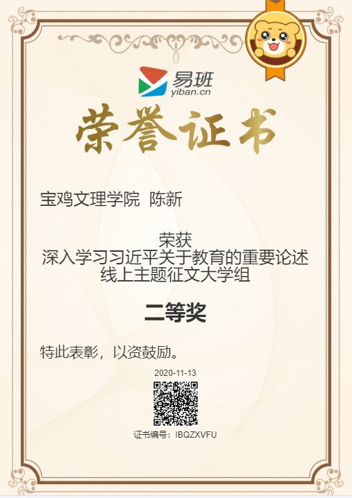 在“深入学习习近平关于教育的重要论述线上主题征文活动”中,经济管理学院陈新同学的作品《中国青年新风华》获得主题征文大学组二等奖。