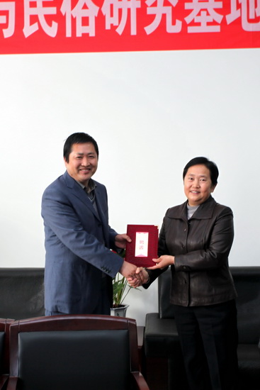 赵荣侠在致辞中代表学院对来自陕、甘两省的关陇方言民俗专家学者莅临大会表示欢迎!她从专业设置、师资队伍、学科建设、人才培养、评估获优、申硕立项等方面介绍了我院的基本情况,并从“关天经济区”建设的高度对基地的建设发展寄予厚望。开幕式上,基地主任赵德利教授宣读了基地聘请平凉市民间文艺协会主席王知三、陇东学院文学院院长徐治堂为兼职研究员的决定,赵荣侠为两位兼职研究员颁发了聘书。
