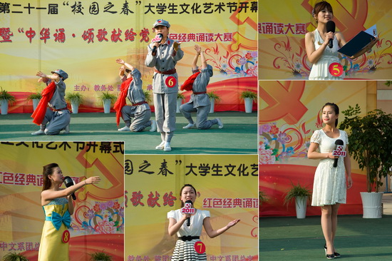 由各系选派的12组选手参加了红色经典诵读大赛。12个节目各有特色,选手们的精彩表现博得了现场观众的阵阵掌声。经过激烈角逐,来自中文系2010级播音与主持专业1班的杜兆、马戈阳拔得头筹。中文系团总支和美术系团总支获得最佳组织奖。
