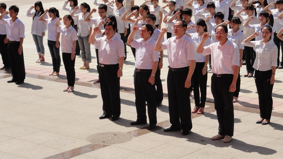 在隆重庆祝中国共产党成立90周年的喜庆日子里,6月24日上午,我院在新校区图书馆前隆重举行“绣党旗 铭党恩 永远跟党走”主题活动暨重温入党誓词仪式。院党委书记、院长王志刚,院党委副书记米晓东,院党委副书记李全武,党委办公室主任张鹏,党委组织部部长郑存库,院团委书记黄玮、副书记党建波等出席活动。