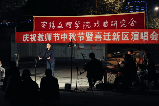 在第二十七个教师节和传统佳节“中秋节”到来之际,为了表达对辛勤耕耘的教师的慰问之情和对喜迁新区的教职工的祝贺之意,我院戏曲研究会于9月9日晚在新文理小区举办了以“庆祝教师节中秋节暨喜迁新区“为主题的戏曲演唱会,30多位研究会伴奏和演唱人员不辞辛苦,精心准备,为喜迁新居的三百多户教职工奉献了一场高质量的戏曲演唱,赢得了观众一阵阵热烈掌声。宝鸡市人民剧团国家二级演员赵会生也应邀到场,演唱了他的拿手唱段《黑虎坐台》等,为演唱会增加了热烈、喜庆的气氛。(院工会戏曲研究会)