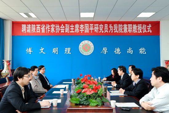 9月28日下午,我院在新校区第一会议室举行聘任仪式,陕西省作家协会副主席、《小说评论》主编李国平研究员受聘为我院兼职教授。院党委书记、院长王志刚出席会议并讲话,副院长赵荣侠主持聘任仪式。党委办公室副主任、院长办公室副主任王永君,人事处处长陈来应,学科建设与研究生教育管理处处长吴毅,科技处处长田延峰,中国语言文学系党总支书记李晓峰,中国语言文学系主任赵德利等参加了聘任仪式。