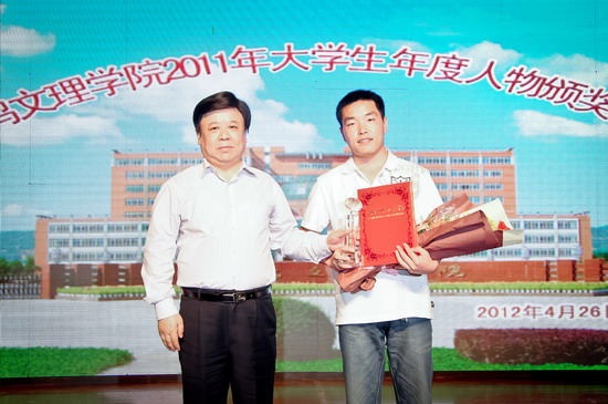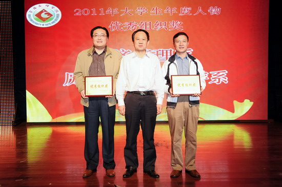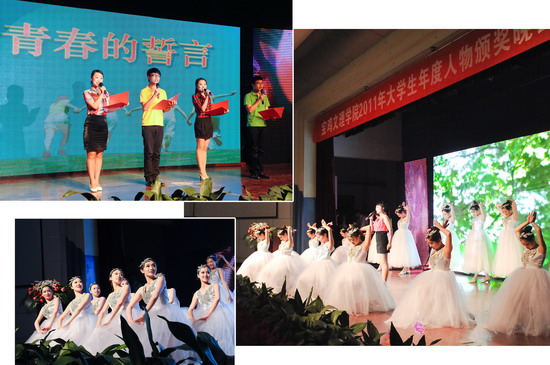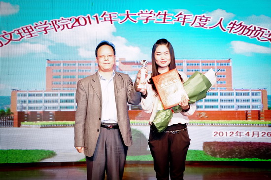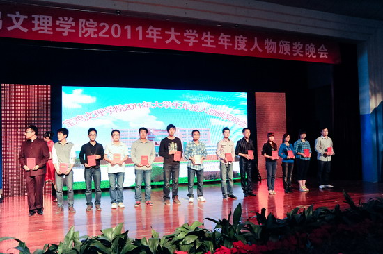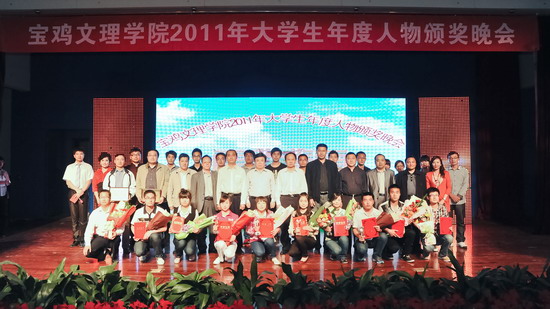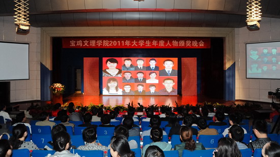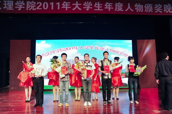 4月26日晚,学校在新校区音乐厅隆重举行 “2011年大学生年度人物”颁奖晚会。党委书记、院长王志刚,党委副书记米晓东出席晚会并为先进单位和个人颁奖,学校相关职能部门领导、各系党总支书记、副书记,全体学生辅导员以及各系学生代表400余人共同观看了晚会。