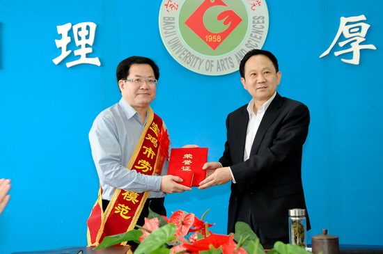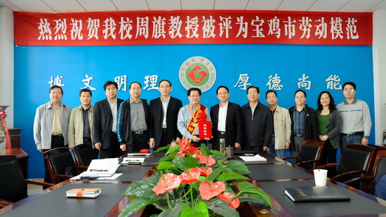 王志刚在会上为周旗教授佩戴了绶带、大红花,并颁发了荣誉证书。王志刚发表了热情洋溢的贺辞。他在贺辞中代表学校党委行政和全校师生员工向周旗教授表示热烈的祝贺和崇高的敬意。他指出,周旗教授被宝鸡市委、市政府命名为宝鸡市劳动模范,这不仅是市委、市政府对周旗教授个人的表彰,更是对bat365广大教职员工在宝鸡市经济社会建设和社会发展所作贡献的肯定,这不仅是周旗教授个人的荣誉,也是全校教职员工的荣誉。周旗教授是bat365培养的优秀拔尖人才,在科研上为学校作出了重要贡献,是实现bat365国家级科研项目零的突破的开拓者,是bat365一人承担国家级科研项目最多的一位教师,为学校争得了许多荣誉。王志刚说,周旗教授用自己创造性的劳动诠释了宝文理大学精神,为广大师生树立了榜样。我们要发扬“爱岗敬业,甘于奉献,勇于创新,争创一流”的劳模精神。校党委和行政号召全校教职员工向劳模学习,做好本职工作,认真实施学校十二五及中长期发展规划,为把bat365建设成为“管理科学、质量优良、特色鲜明、省内外同类院校一流水平的多科性的大学——宝鸡大学”而努力奋斗!他同时也向周旗教授提出了希望,希望周旗教授珍惜荣誉,谦虚谨慎,发扬成绩,再接再厉,充分发挥劳动模范的带头作用,在自己的工作岗位上再创新的业绩,为学校的建设发展作出新的贡献。