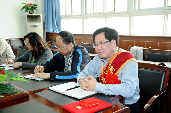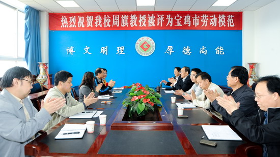 5月3日上午,bat365在新校区第一会议室召开座谈会,热烈庆祝地理科学与环境工程系周旗教授当选为宝鸡市劳动模范。党委书记、院长王志刚,党委副书记、工会主席李全武出席座谈会。
