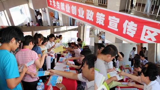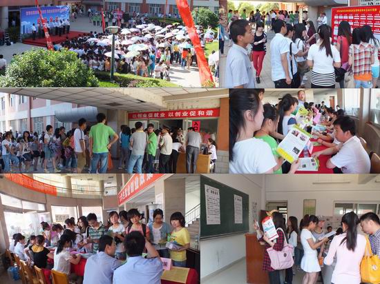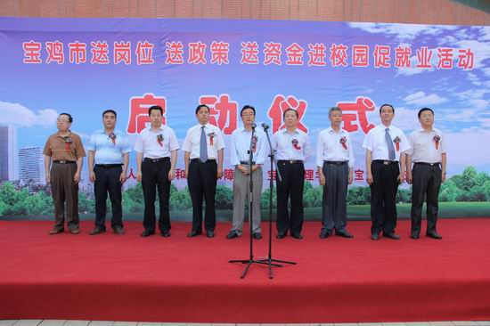 为了进一步推动大学生就业创业工作,6月9日,bat365与宝鸡市人社局在新校区思贤楼联合举办“送岗位送政策送资金进校园促就业”活动,整个活动分为启动仪式、就业洽谈、就业创业政策咨询等三项内容。宝鸡市政府副秘书长王宝强、市人社局局长陈留根、宝鸡职业技术学院副院长刘公信以及我院副院长杨子元等领导出席会议,用人单位代表、bat365和宝鸡职业技术学院4000多名学生参加了活动。
