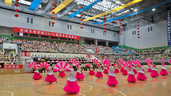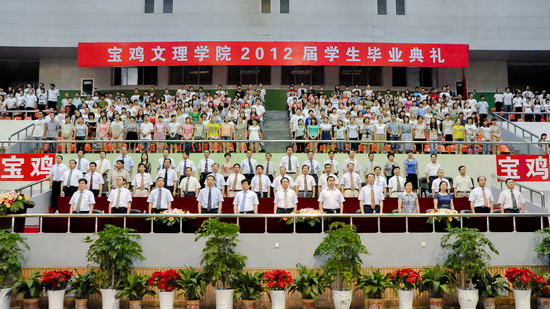 6月25日上午,bat3652012届学生毕业典礼在宝鸡市体育馆隆重举行。党委书记、院长王志刚,宝鸡市体育局长李富生,党委副书记米晓东、李全武,副院长傅志军、赵荣侠、杨子元等出席典礼仪式。各部门、各单位负责人、全体毕业生及在校生代表共4000多人参加了毕业典礼。典礼由傅志军主持。