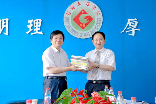 在实地考察后,学校在新校区第一会议室组织召开座谈会。米晓东主持座谈会。王志刚从办学历史、师资队伍、学科建设和科研工作、区位优势、评估获优、发展前景等六个方面向陈光明一行介绍了bat365的基本情况。他在谈到bat365“十二五”及中长期发展规划时着重介绍了bat365“两个坚持”的办学指导思想:坚持“以育人为根本,以教学为中心,以学科建设为龙头,以师资建设为重点”;坚持“以提高质量求生存,以提升层次求发展,以鲜明特色求地位,以服务地方求支持”。他说,bat365提出“质量立校、人才强校、学科兴校、文化铸校、特色名校、服务地方“等六大发展战略,旨在使学校“立足宝鸡,服务陕西,面向西部,辐射全国,成为陕西西部基础教育、经济建设、社会发展、科技创新人才的重要培养基地”,成为“建设以人才培养为主要任务,具有鲜明办学特色和学科优势的教学型大学”,为国家和社会培养出更多的“品德优、基础实、能力强、素质高”的应用型人才。他还特别指出,学校今后十年以建成“结构合理、管理科学、质量优良、特色鲜明、竞争力强、社会满意、省内外同类院校一流水平的多科性大学——宝鸡大学”为奋斗目标。他在谈到筹建宝鸡大学时,简要回顾了2011年5月25日宝鸡市人民政府与bat365在线中国官网登录入口隆重举行的筹建宝鸡大学签字仪式,并建议学校与宝鸡市共同落实签署的《备忘录》条款,扎实推进宝鸡大学筹建工作。