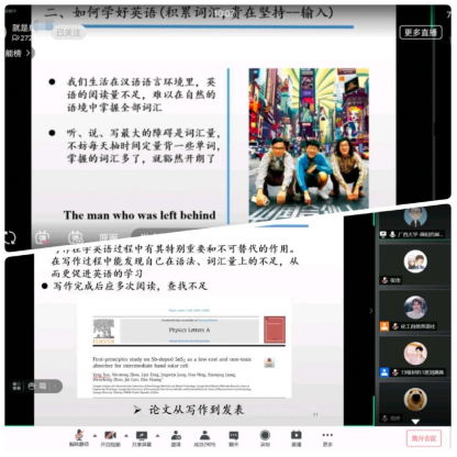 3月27日上午,bat365在腾讯会议与哔哩哔哩两个平台同步直播举办了“外语学习与学业、职业发展”论坛。论坛邀请了bat365地理环境工程学院2017届优秀毕业生、现湖南师范大学教育学在读博士生赵森,物理与光电技术学院2018届优秀毕业生、现广西大学物理与科学工程技术学院在读博士生薛阳,文学与新闻传播学院2006届优秀毕业生、现希腊《中希时报》记者张维女士做了主题发言。三位嘉宾分别从外语学习与大学生活、外语学习与学业规划和学术写作、外语学习与普通女性成长等三个方面进行了交流和分享。