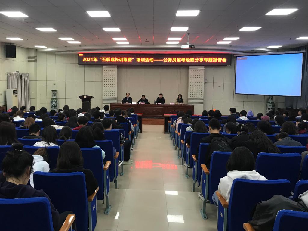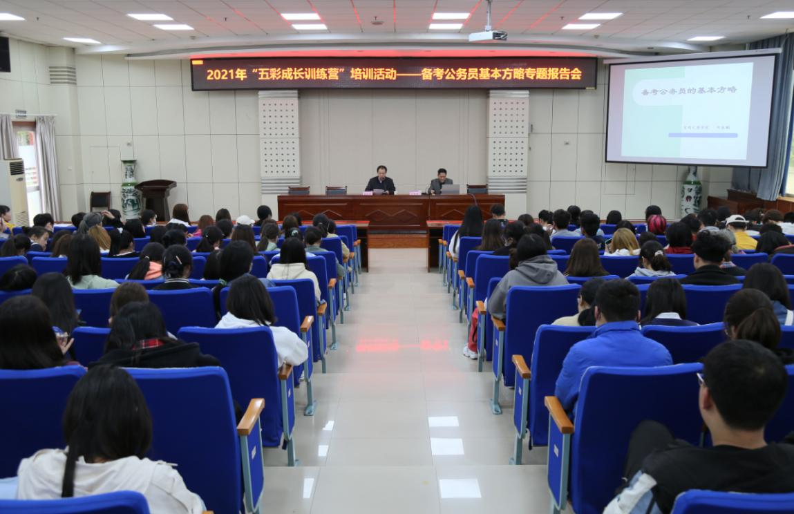 4月21日、23日下午,学工部(处)联合校团委、招就处、保卫处分别在高新校区木铎厅、石鼓校区综合楼2号报告厅举办了3场2021年春季学期“五彩成长训练营”第一期培训活动。本期活动分别由马克思主义学院教授何振鹏,政法学院、化学化工学院公务员招考成功毕业生来显斌、苏兴国、刘倩茹作了“公务员备考基本方略”和“公务员招考经验分享”专题报告会,共有600多名学生参加了培训。