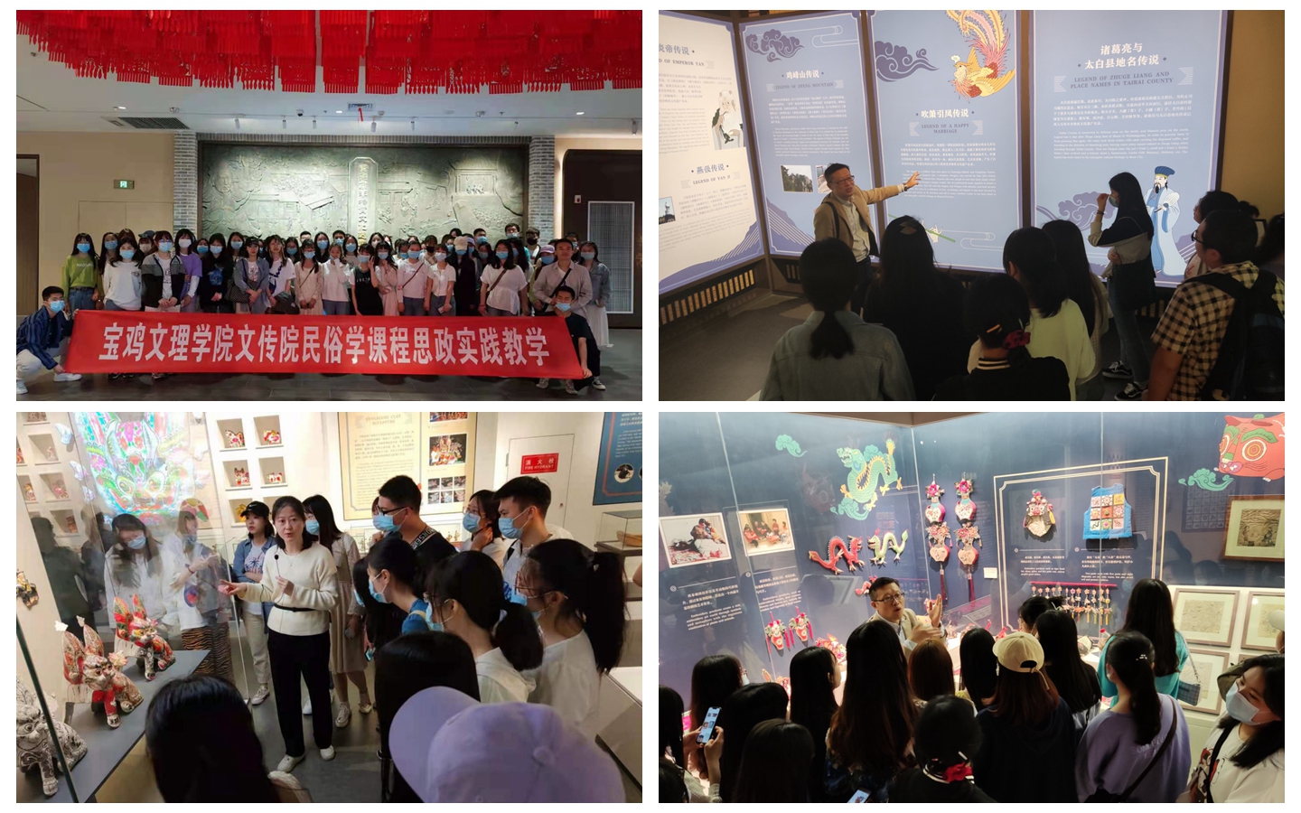 为贯彻落实课程思政,加强学生民俗文化素养,5月6日上午,文学与新闻传播学院由王渭清老师带队,组织200多名2018级汉语言文学专业学生分三批依次进入宝鸡市非物质文化遗产陈列馆考察。