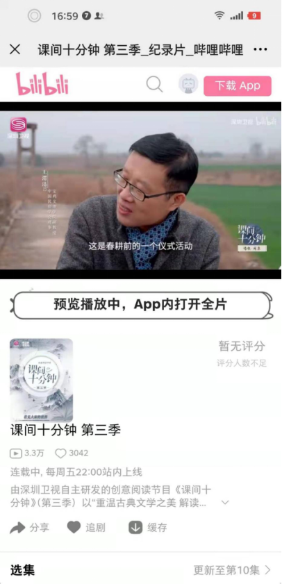 《课间十分钟》是深圳卫视近年来自主研发的创意阅读节目,以“重温古典文学之美,解读城市文化底蕴”为主题,每期遴选一部大众耳熟能详的古典诗文著作或一位人文大家,邀请相关文化学者作为主讲人或嘉宾,与主持人一同亲临城市文化古迹,从现代视角怀古思今,畅谈浩瀚古籍背后的历史故事和人文风骨。
