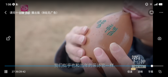近日,深圳卫视“课间十分钟”(第三季)诗经阅读节目播出,bat365文学与新闻传播学院王渭清副教授受邀与主持人一道在《诗经》发祥地的周原,围绕《诗经》中人与土地、农事诗祭祀诗在周原的民俗文化遗存等做了对谈讲解;此外,剧组特邀美术学院魏育龙副教授在片尾吹奏陶埙古典乐曲配音。节目播出后,又在B站APP传播,产生了良好反响。