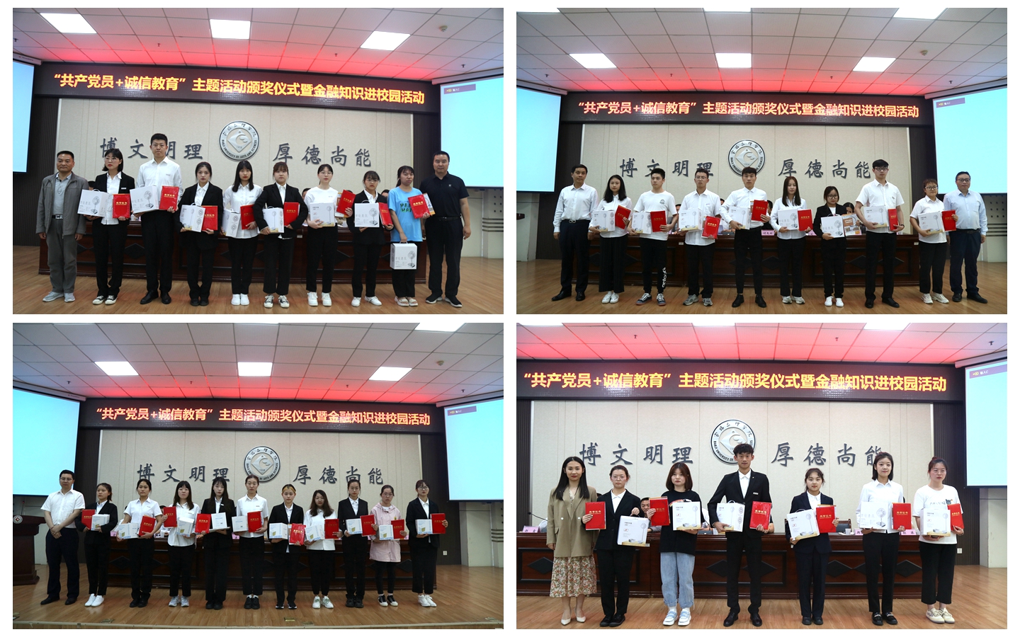 自5月13日起,学工部(处)开展了“共产党员+励志成才之星”评选、“书写诚信家书 讲述诚信故事”诚信主题征文、生源地信用助学贷款毕业生还款政策宣讲和召开诚信主题班会等形式多样的“共产党员+诚信教育”主题活动;各二级学院结合学科、学生特点举办了“我为诚信代言”签名、“非黑即红”诚信主题沙龙、诚信故事分享会等特色活动,一个月来全校累计举办“共产党员+诚信教育”主题活动184场(次)、参与学生超过2.1万人次。该主题活动是学工部(处)结合党史学习教育开展资助育人工作的生动实践,充分发挥了共产党员先锋模范作用,培养了受助学生自立自强、诚信感恩、勇于担当的良好品质,激励广大受助学生心怀家国、励志图强、为国奉献。