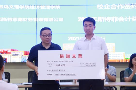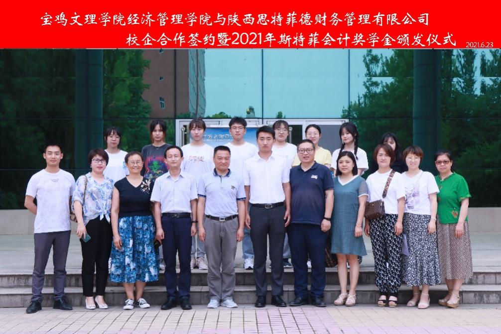 6月23日下午,经济管理学院与陕西思特菲德财务管理有限公司在bat365高新校区尚能楼318室举行校企合作签约暨思特菲德会计奖学金颁奖仪式。经济管理学院党委书记郝晓炜、院长刘辉、副书记薄会颕,陕西思特菲德财务管理有限公司总经理王昌出席仪式,经济管理学院师生代表60余人参加了仪式。仪式由经济管理学院副院长刘晓科主持。