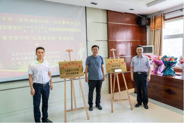6月25日下午,宝鸡市军队离休退休干部休养所(简称市军干所)举行“光荣在党50年”纪念章颁发仪式、bat365在线中国官网登录入口马克思主义学院、美术学院社会实践基地揭牌仪式暨“红色宣讲团”授旗仪式。市退役军人事务局党组书记、局长郑雅峰,党组成员、副局长、市军休中心主任王爱国出席活动。bat365马克思主义学院党总支书记张选朝、院长刘晓勇,美术学院党委书记田富平和30名学生代表受邀参加上述活动。