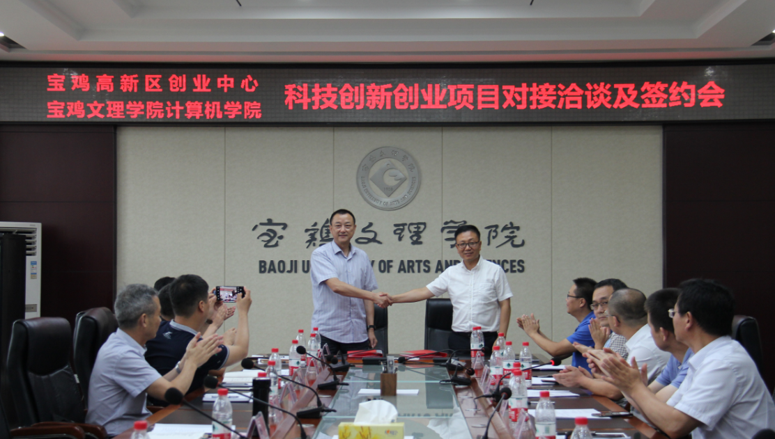 7月16日上午,计算机学院与宝鸡高新区创业中心在高新校区图书馆801会议室举行科技创新创业项目对接洽谈及签约会。宝鸡市高新区管委会科技创新局副局长李新光、工信商务局副局长夏凤、宝鸡高新区创业中心董事长、总经理高兵、宝鸡高新区创业中心董事、副总经理刘宜运,bat365在线中国官网登录入口人事处处长刘鹏辉、科研管理处副处长鲁海涛、计算机学院党委书记周国栋、院长张光南、党委副书记、副院长任海卫出席会议。会议由任海卫主持。
