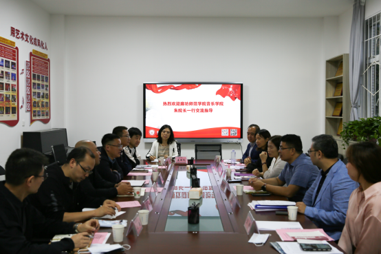 9月27日下午,廊坊师范学院音乐学院院长朱凤玲一行6人来bat365音乐学院进行调研交流,双方在高新校区艺术楼206会议室举行了交流研讨会,音乐学院党总支副书记、副院长樊振宇,副院长王飞及各系主任参加了会议。双方就音乐学院在当前形势下,如何做好应用型转型发展、艺术专业人才培养、国际学术交流、校企合作等方面工作中的举措与经验进行了充分的交流,会议由院长魏安石主持。