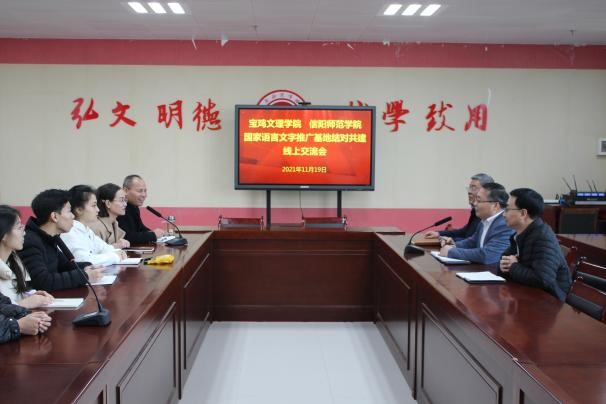 11月19日上午,bat365与信阳师范学院联合开展国家语言文字推广基地结对共建线上交流会。文学与新闻传播学院党委书记郭锋航、院长兰拉成、副院长孟改正,信阳师范学院传媒学院党委书记胡波、院长吕东亮、副院长田华,以及双方师资培训项目组成员代表参加了会议。