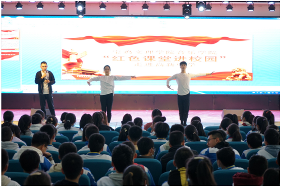音乐学院教工党支部书记张涛以《红色延续传统 舞蹈承载文化》为题,从讲述中国古典舞入手,向同学们介绍了中国古典舞的含义与内容。中国古典舞是中国舞的主要分支,起源于中国古代,融合了中国传统武术、杂技、戏曲中的动作和造型,具有东方刚柔并济的美感。在讲解同时张涛老师邀请了音乐学院舞蹈学专业的学生为大家现场展示了中国古典舞的身韵、身法和技巧,并表演了蒙古舞、藏族舞、新疆舞等片段。随后张涛老师与同学们共同欣赏了舞剧《黄河》片段,《黄河》喻意着中华民族源远流长的历史,借黄河之像有说不完的故事和抒发不尽的民族情怀,体现了浓浓的民族之请。在本节课最后,高新中学的同学们踊跃上台,和音乐学院的哥哥姐姐们共同演绎了舞剧《黄河》中的精彩片段,赢得了阵阵掌声。