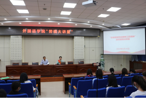 5月19日,全国劳动模范、三秦工匠、宝钛集团有色行业高级技师郭文生应邀为外国语学院师生作了题为《在全社会弘扬劳模精神劳动精神工匠精神》的宣讲报告会。报告会由外国语学院党委副书记杨子祁主持。