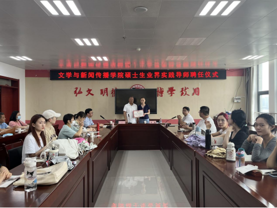 院长兰拉成教授为李翃颁发聘书。他热烈欢迎并感谢李翃女士加入学院研究生实践导师的队伍,并对广播电视专硕研究生规模的壮大、培养质量的提升表示期待。